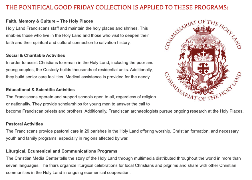 Every year on Good Friday, a collection is taken up in Catholic Churches to support the work of the Franciscans working in the Holy Land. Christians there rely heavily on the help that comes to them from this worldwide collection.
